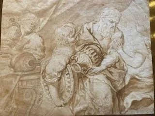 The reverse is a brown ink drawing with wash of a water bearer, it looks like it has been cropped with figures falling off the page. It has been suggested that this may be by Domenico Piola, a late Baroque painter from Genova (1627-1703).