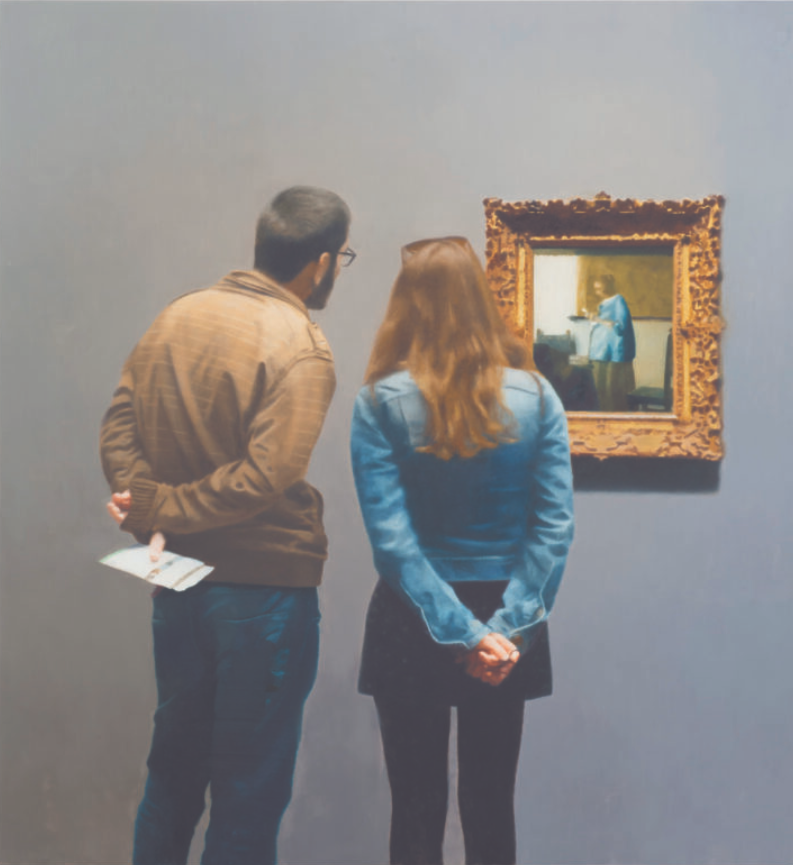For example, some figures in his work appear out-of-focus and ephemeral, while other areas are bathed in light. Winstanley’s meticulous painting style and soft light effects remind us of aspects of Vermeer’s work. His piece titled, Looking at a Vermeer directly points out the Dutch artist as an inspiration.