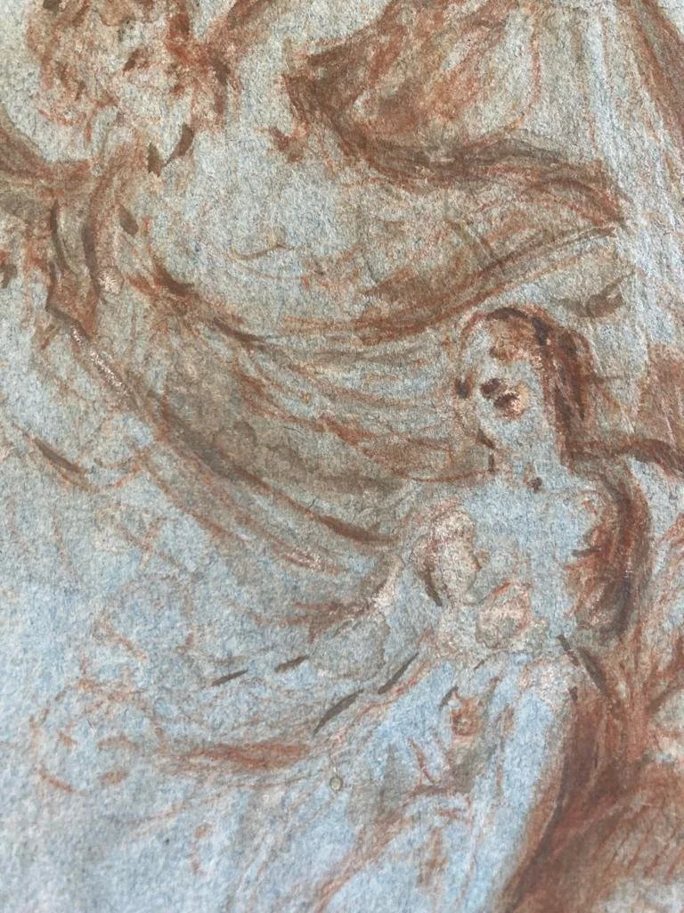 Red chalk with white chalk highlights on blue paper