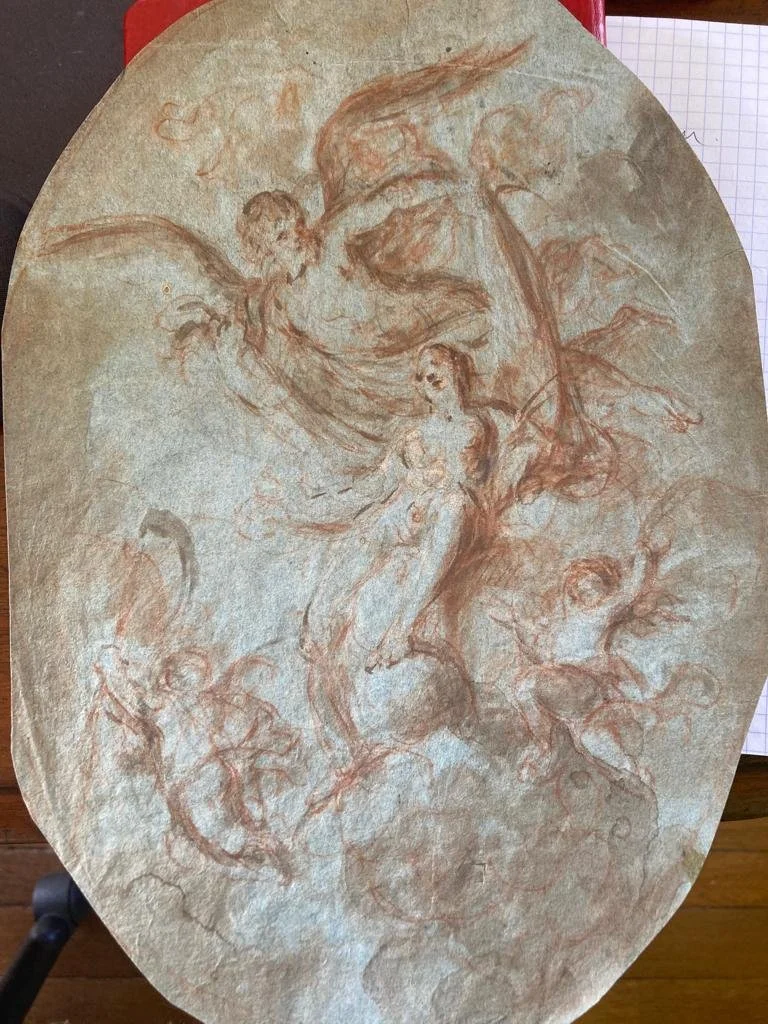 The collection is unknown as is the artist. It is potentially Venetian, c.17th. It could be an allegory of day or time. The work depicts a female figure of a goddess standing on a globe and it has a Tiepolesque feel.